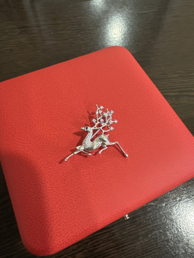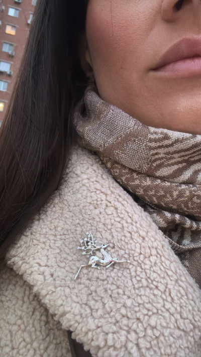 Очень красивая брошь. Лёгкая, сама нежность,рожки украшены фианитами покрупнее , а грудь мелкими. Сама фигурка грациозна и прекрасна.Красиво смотрится на чёрном фоне. Огромное спасибо Костромским ювелирам за их прекрасные украшения🤗