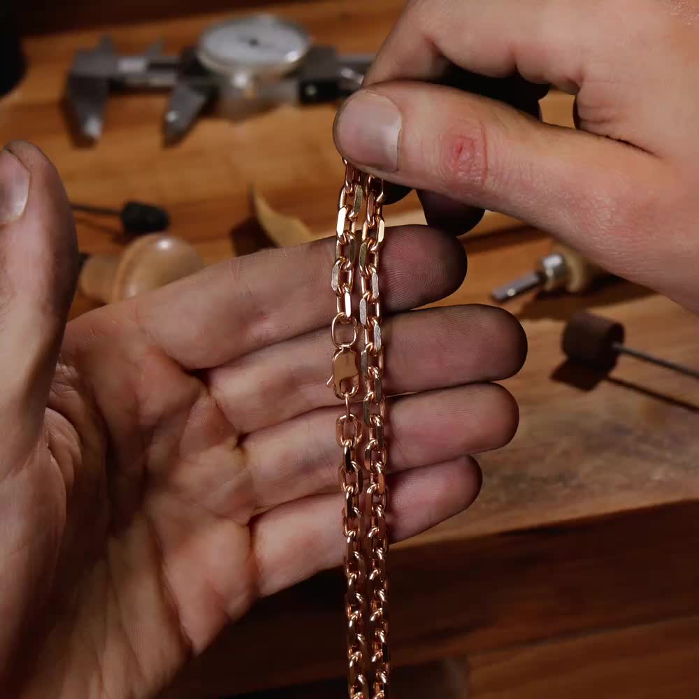 Якорное плетение - настолько надежное, что можно "вешать якорь". Звенья расположены под прямым углом друг к другу, от чего цепь получается объемной и крепкой. Плетение универсально, подходит и женщинам, и мужчинам. Классическая якорная цепь состоит из звеньев продолговатой формы с закругленными концами. Для усиления блеска края обрабатывают алмазной гранью.