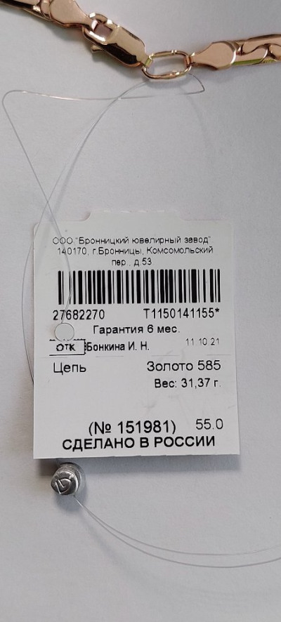 Долго искал себе новую золотую цепь 585 пробы из розового золота и нашёл там где не ждал, на сайте Sunlight. Сначала ждал какого-н. подвоха, так как уж слишком хорошая скидка была на эту цепочку, но при получении взвесил золото, проверил все пробы и оказалось всё как на фото. Только вес цепочки был чуть ниже заявленного на сайте, указано на сайте что цепь размером 55см весит 32,75гр, а на самом деле 31,37гр., но даже с этой разницей цена получилась за грамм очень низкой всего 3600р/гр., при том что в других ювелирных магазинах сейчас цены по 4700р/гр розового золота. Плюс цепочка была хорошо упакована в мягкий бархатный и бумажный пакетик. В общем, рекомендую цепь и магазин, буду заказывать тут ещё обязательно, а то в отзывах читал об этом магазине противоречивые комментарии и ждал тоже нежданчика, но повезло и купил то что хотел!!!
