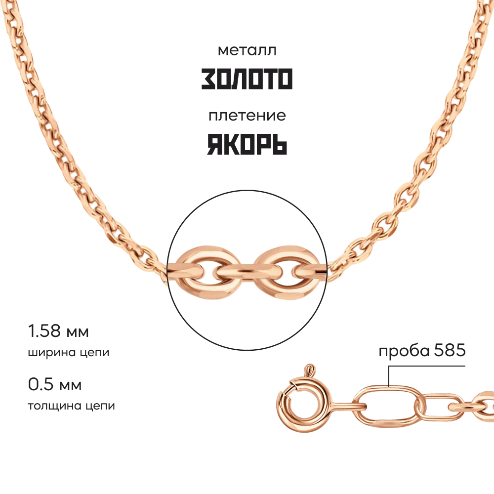 Якорное плетение - настолько надежное, что можно "вешать якорь". Звенья расположены под прямым углом друг к другу, от чего цепь получается объемной и крепкой. Плетение универсально, подходит и женщинам, и мужчинам. Классическая якорная цепь состоит из звеньев продолговатой формы с закругленными концами. Для усиления блеска края обрабатывают алмазной гранью.