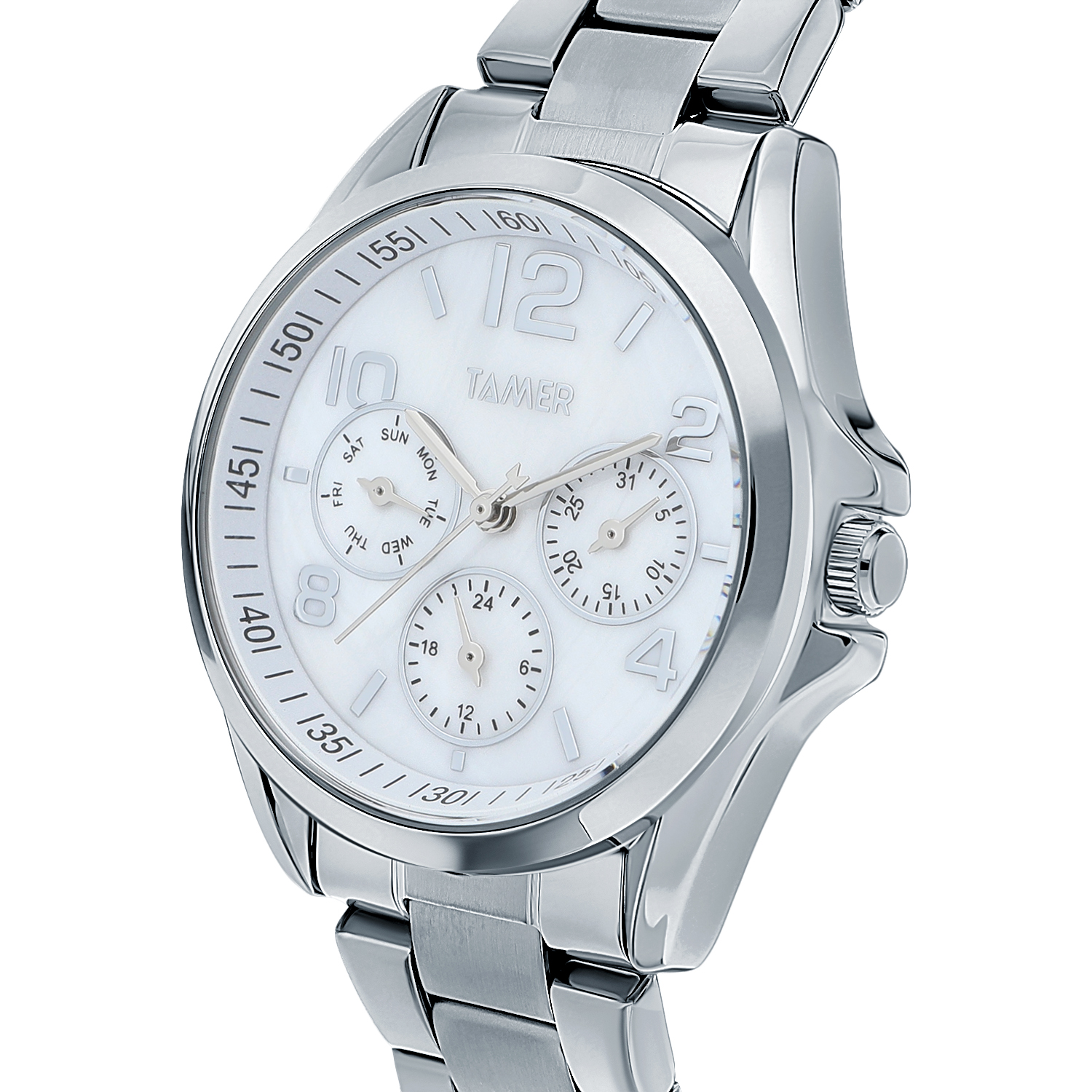 Корпус выполнен из металла*, минеральное стекло с антибликом защищает циферблат от внешнего воздействия. Японский кварцевый механизм Seiko VX3J обеспечивает точный ход и оснащен функциями времени в 12/24 часовом формате, секундной стрелки, даты и дня недели. Водозащита 3 bar (30 m/99 ft) защитит от брызг и дождя.