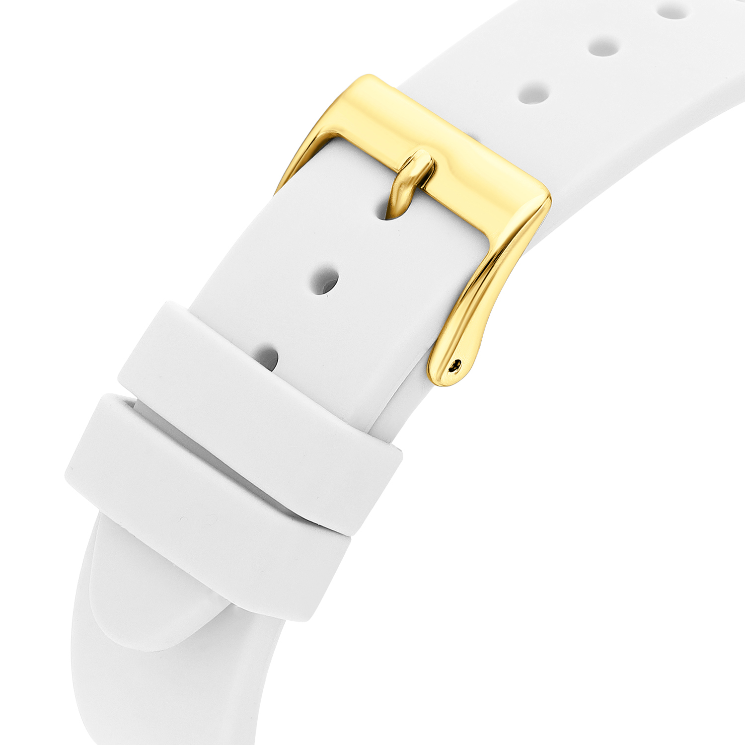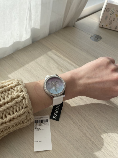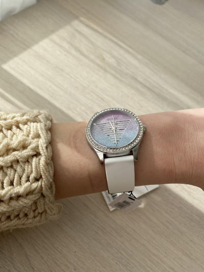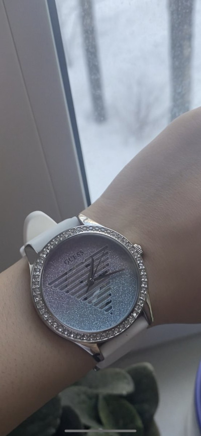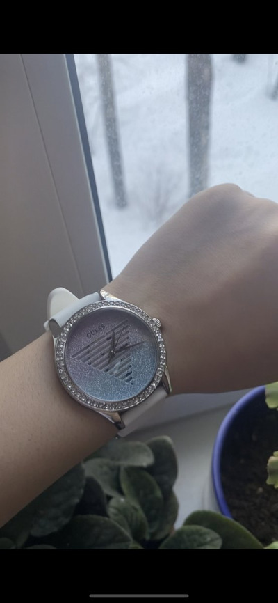 Часы выглядят аккуратно на руке, несмотря на довольно большой циферблат. Стразы сияют. Выбрала эту модель тк благодаря резиновому ремешку не такие тяжелые и претенциозные как аналоги с металлическим. Покупкой довольна