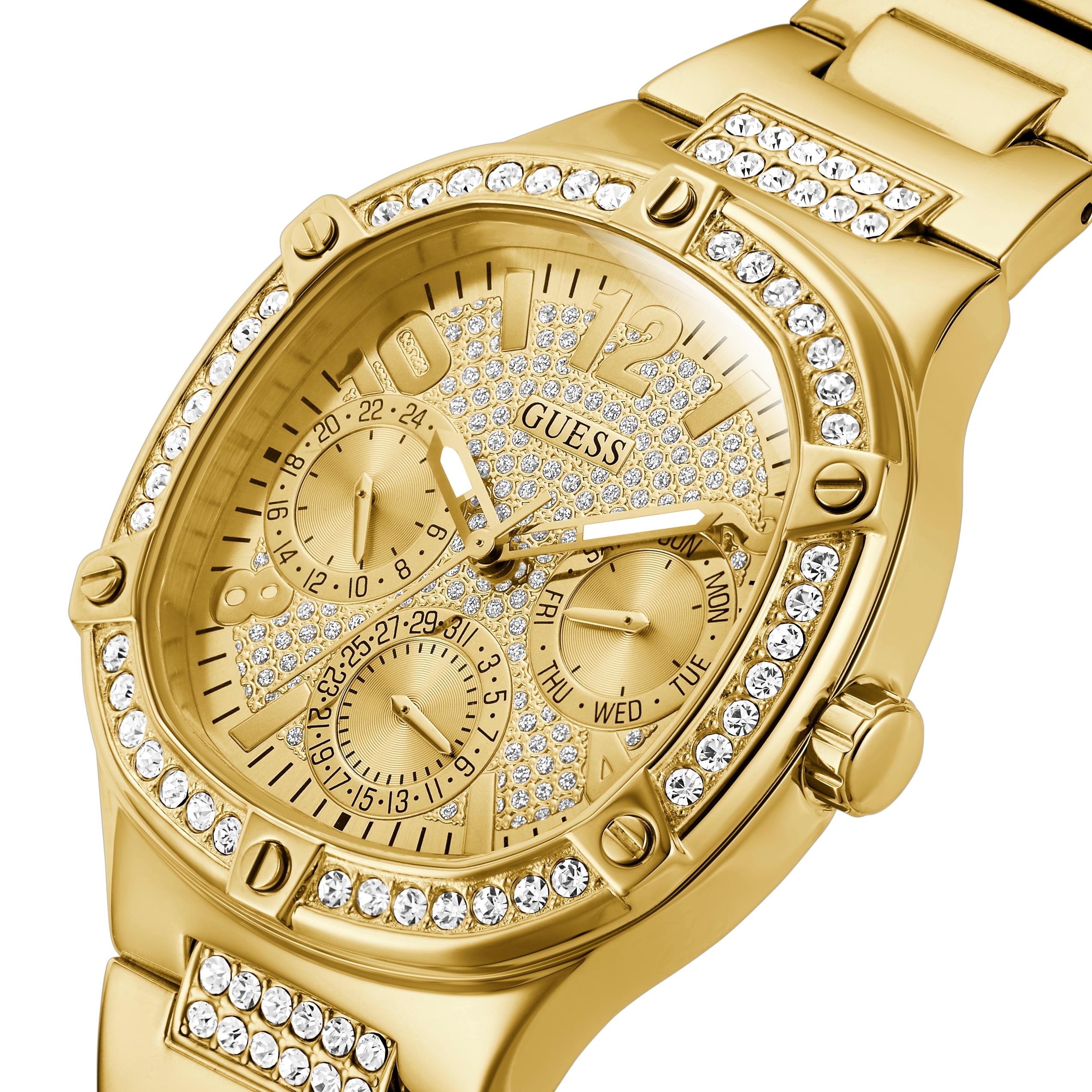 • Женские наручные часы GUESS модель GW0558L2 из коллекции GUESS SPORT. Японский кварцевый мультифункциональный механизм VX7JE1S SEIKO (TMI) с вынесенными на отдельные циферблаты датой, днем недели и часовой стрелкой в режиме 24 часа использующий элемент питания SR927SW. Стальной корпус размера 40 мм. Минеральное стекло. Стальной браслет. Водостойкость 1 АТМ (защита от влаги). Остерегайтесь попадания воды на корпус часов. GUESS – лидер в индустрии фешен часов по длительности присутствия на рынке и по ширине коллекции, ежегодно создает более 100 новинок. Компания GUESS Watches, основанная в 1984 году в Лос-Анджелесе (США) как пионер революции, возглавила трансформацию часов из простого инструмента для определения времени в стильный аксессуар. Бренд не боится экспериментировать. Разнообразные формы корпуса, сложно декорированные циферблаты, уникальный дизайн браслетов. GUESS – это про тренды и технологии в мире моды. Это яркие и дизайнерские часы, призванные угодить самым смелым фешн-драйверам и энтузиастам моды по всему миру. Страна-изготовитель: Филиппины. При изготовлении используются только надежные Японские механизмы. ВНИМАНИЕ! Заявленная водостойкость гарантируется только при плотно закрытой или закрученной заводной головке!