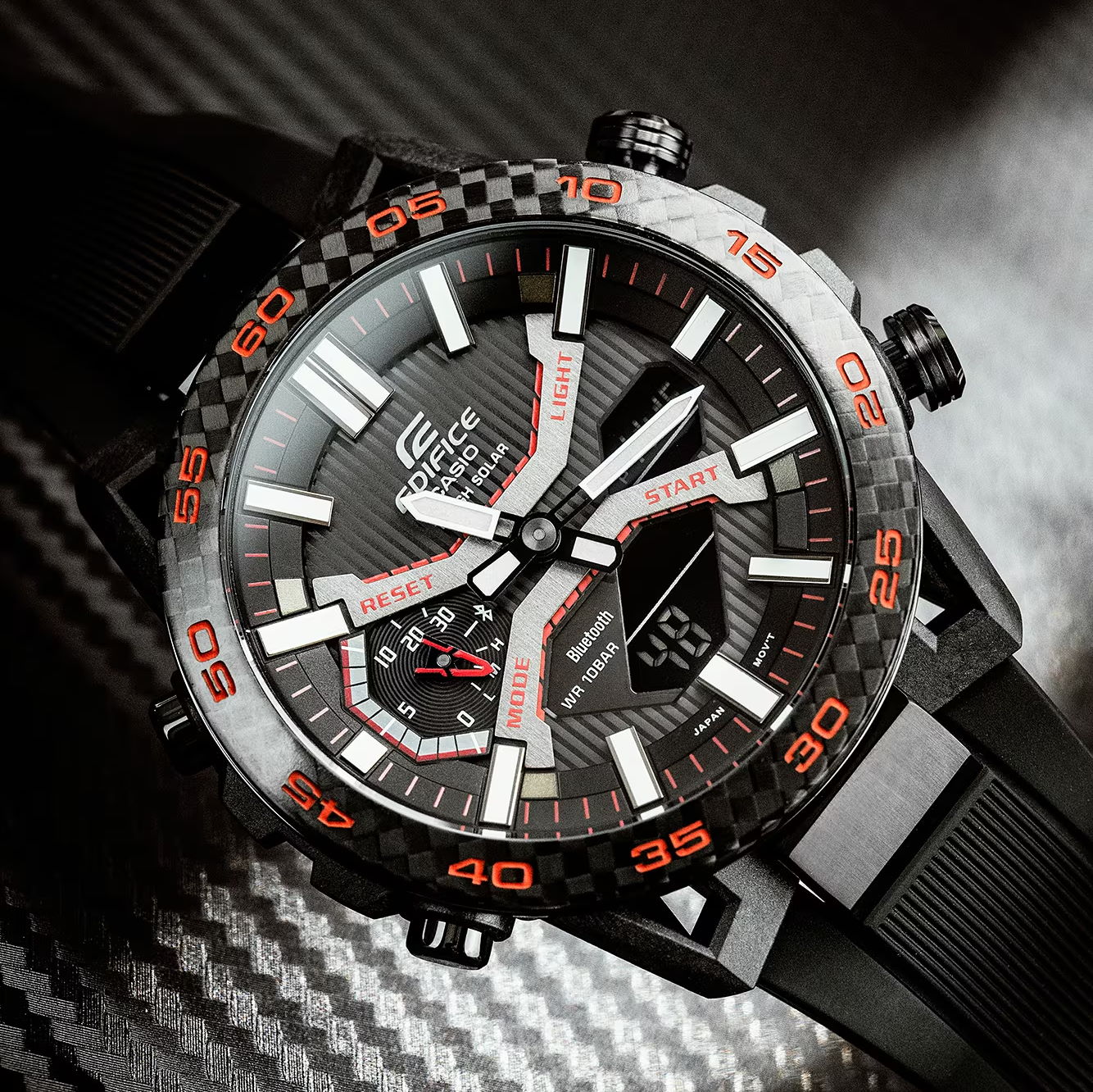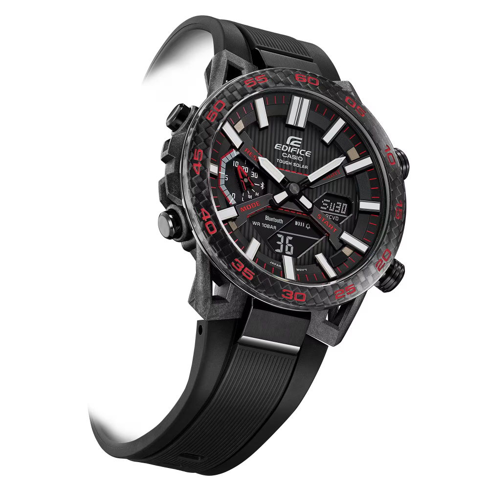 Редкий лимитированный релиз в коллекции Edifice 2022 года из топовой аналого-цифровой серии ECB-2000 в усиленном карбоном корпусе с черным циферблатом и яркими красными деталями, покрытым минеральным стеклом и фактурным карбоновым безелем. Модель получила динамичный и стильный циферблат, который сочетает в себе стрелочную индикацию, два цифровых дисплея и стрелочный ретроградный указатель у отметки девяти часов. Особенностью модели является ее карбоновый корпус — это первые часы в семействе Edifice в корпусе из карбона, до этого все модели линейки Эдифис имели только стальные корпуса. Необычная харизматичная конструкция корпуса выполнена в стилистике подвесок в формульных гонках, где колеса болида крепятся к шасси на карбоновых лучах. В начинке модели используется новый мощный модуль, оснащенный Bluetooth, благодаря чему, часы могут автоматически подключаться к вашему смартфону для синхронизации точного времени, удобной настройки или для быстрого поиска телефона, если он как обычно куда-то пропал (смартфон начнет издавать звуковые сигналы, при нажатии на специальную кнопку на часах). Стоит отдельно отметить наличие в модели солнечной батареи, водозащиты в 10 бар, функции мирового времени, секундомера и таймера обратного отсчета, пяти ежедневных будильников и ежечасного сигнала, возможность отображения текущего дня недели на русском языке. Все это японские инженеры сумели уместить в корпусе толщиной в 10.8 миллиметров.