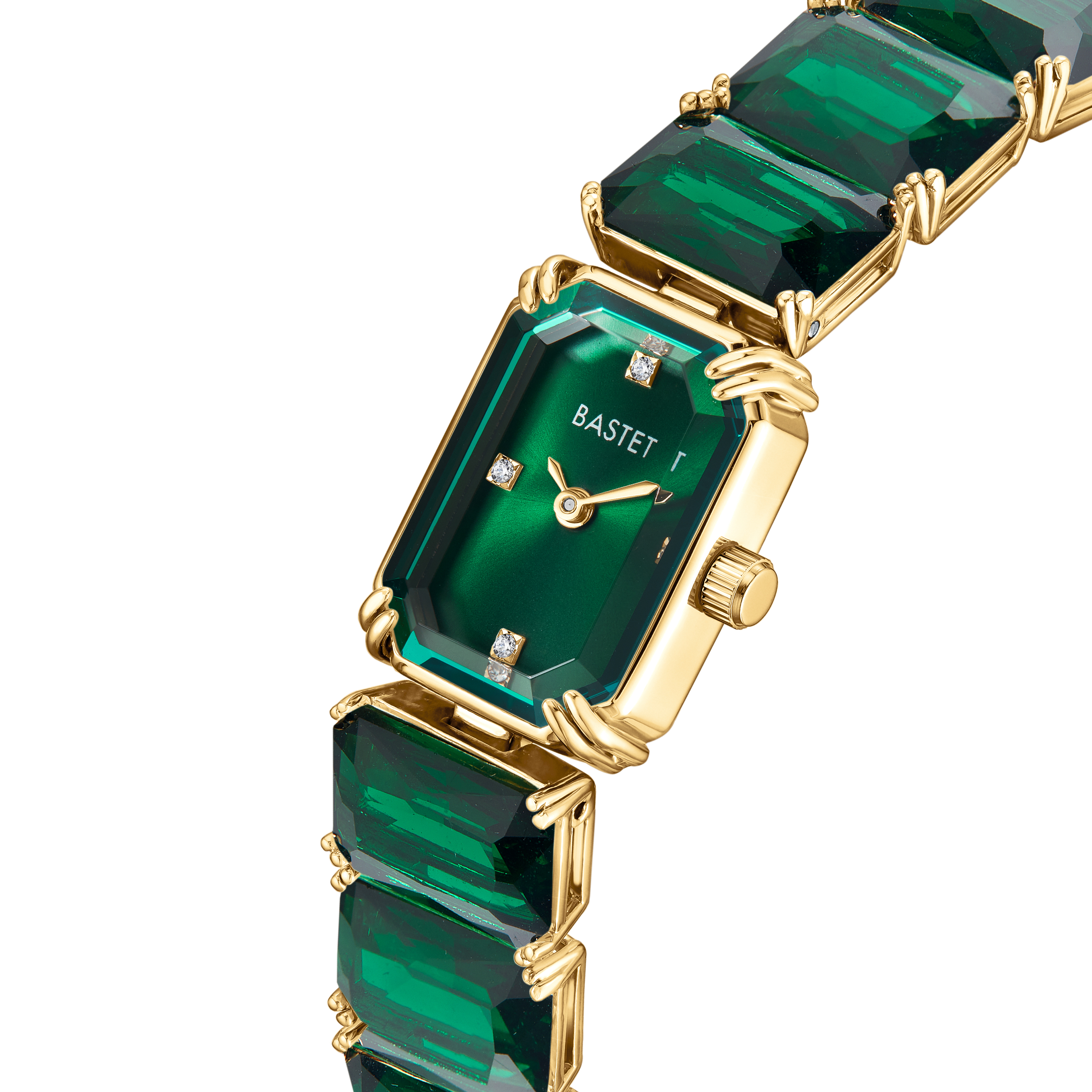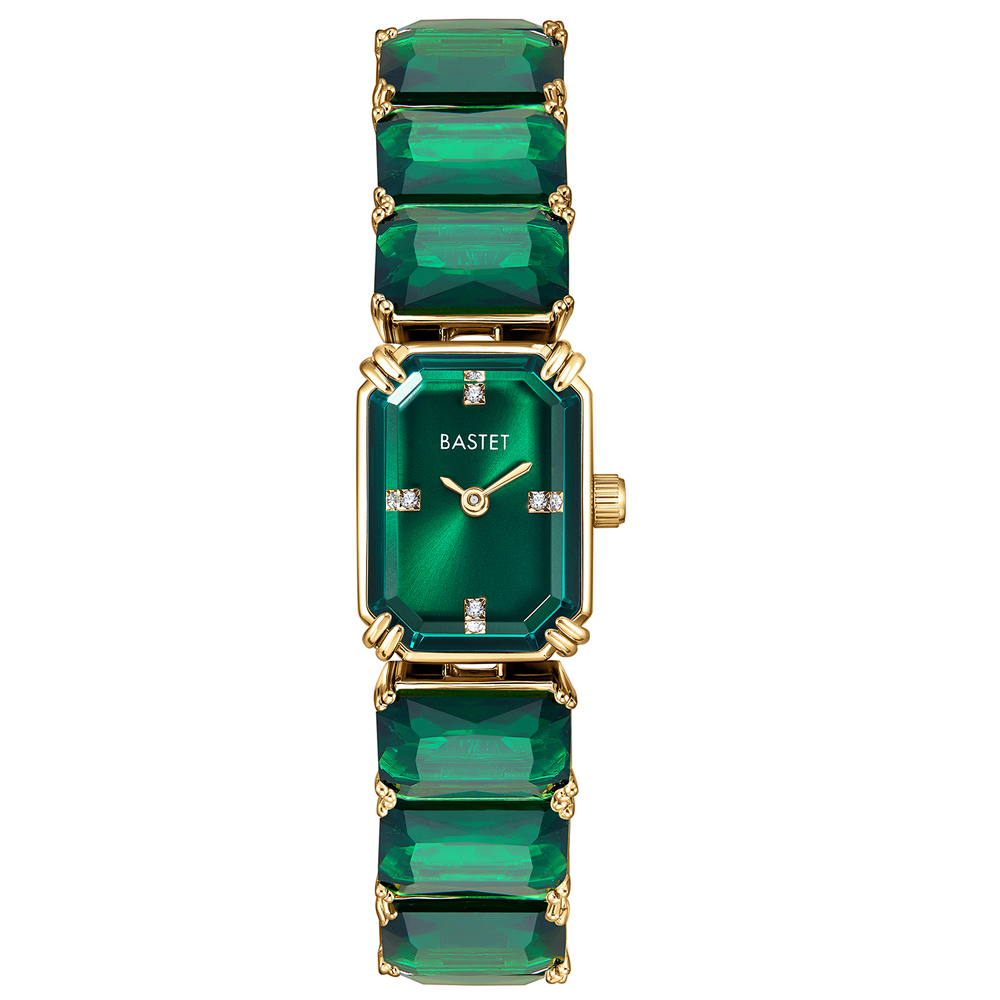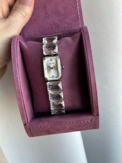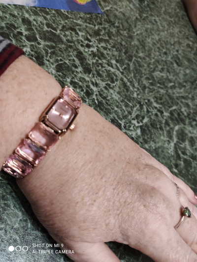 Часы изумительные, такой необычный дизайн, сочетание позолоченных звеньев со звеньями из розовых камней, сами часики с розовым циферблатом, розовым стеклом, вытянутой прямоугольной формы, с четырьмя камушками на циферблате из фианитов. Всё это делает эти часы исключительными. У них очень удобная застежка. А как они упакованы, в какую розово-сиреневую бархатную коробочку красивой формы - это просто делает часы часами премиум класса.