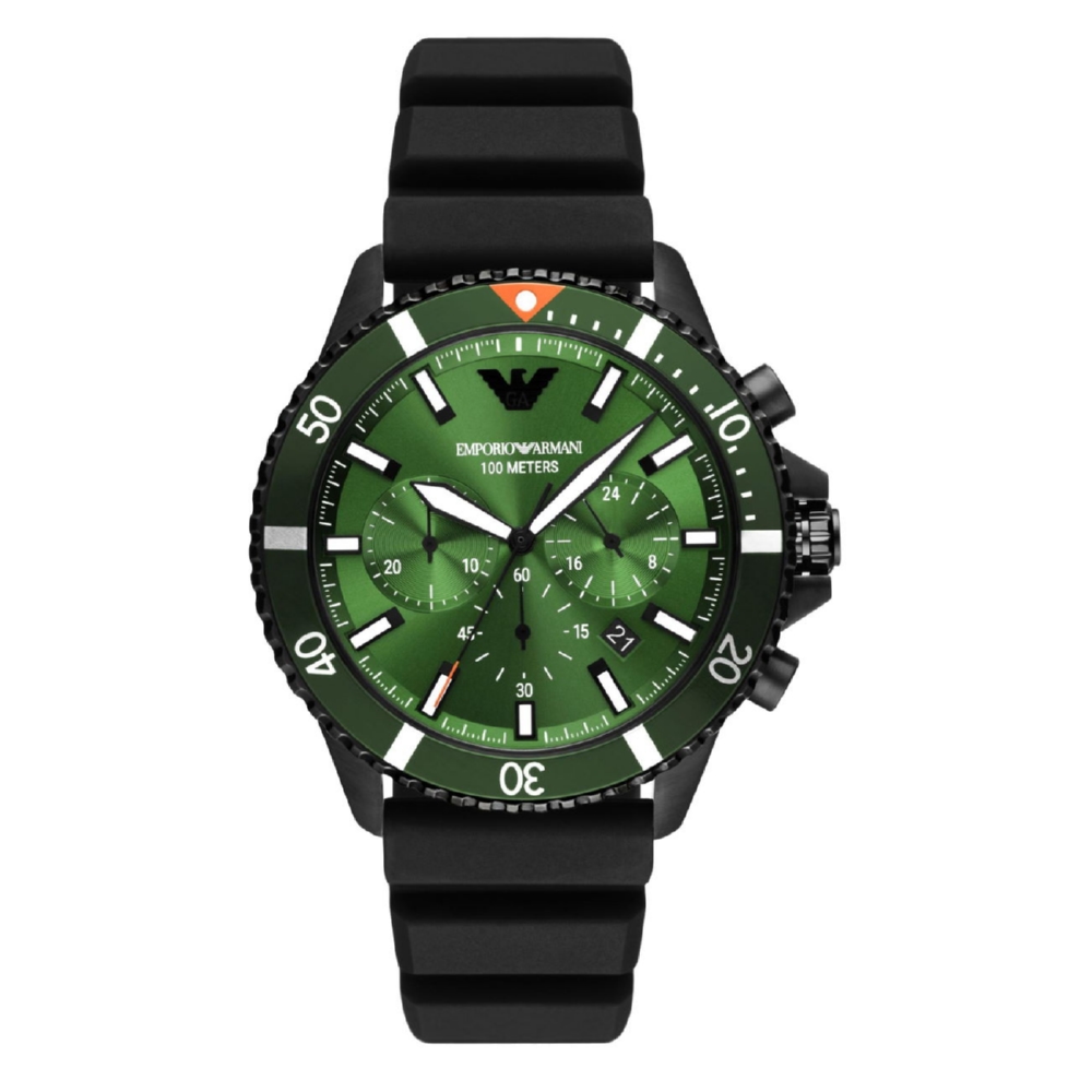 Наручные кварцевые мужские часы марки EMPORIO ARMANI артикул AR11463. Стальной корпус размера 43 мм и толщиной 12 мм. Кроме стандартных в модели добавлена функция секундомера (хронограф) и часовая стрелка в режиме 24 часа. Минеральное стекло. Ремешок из полимерного материала (силикона). Водостойкость 10 АТМ допускает нахождение в воде, но без глубоких погружений. Молодежная линия одежды и аксессуаров Emporio Armani была создана Джоржио Армани в 1981 году. Под этим брендом итальянский Модный дом Giorgio Armani начал выпускать одежду в стиле casual для молодой аудитории от 20 до 35 лет. Поэтому цены на продукцию Emporio Armani более доступные в сравнении с основной линией Модного Дома. ВНИМАНИЕ! Заявленная водостойкость гарантируется только при плотно закрытой или закрученной заводной головке!