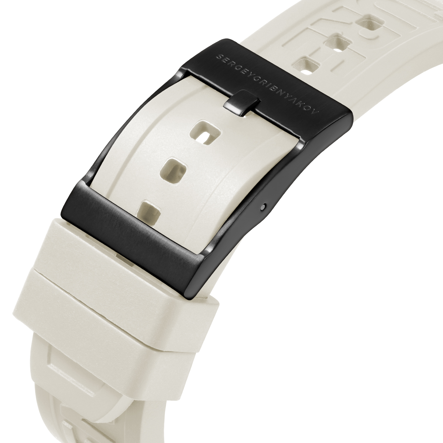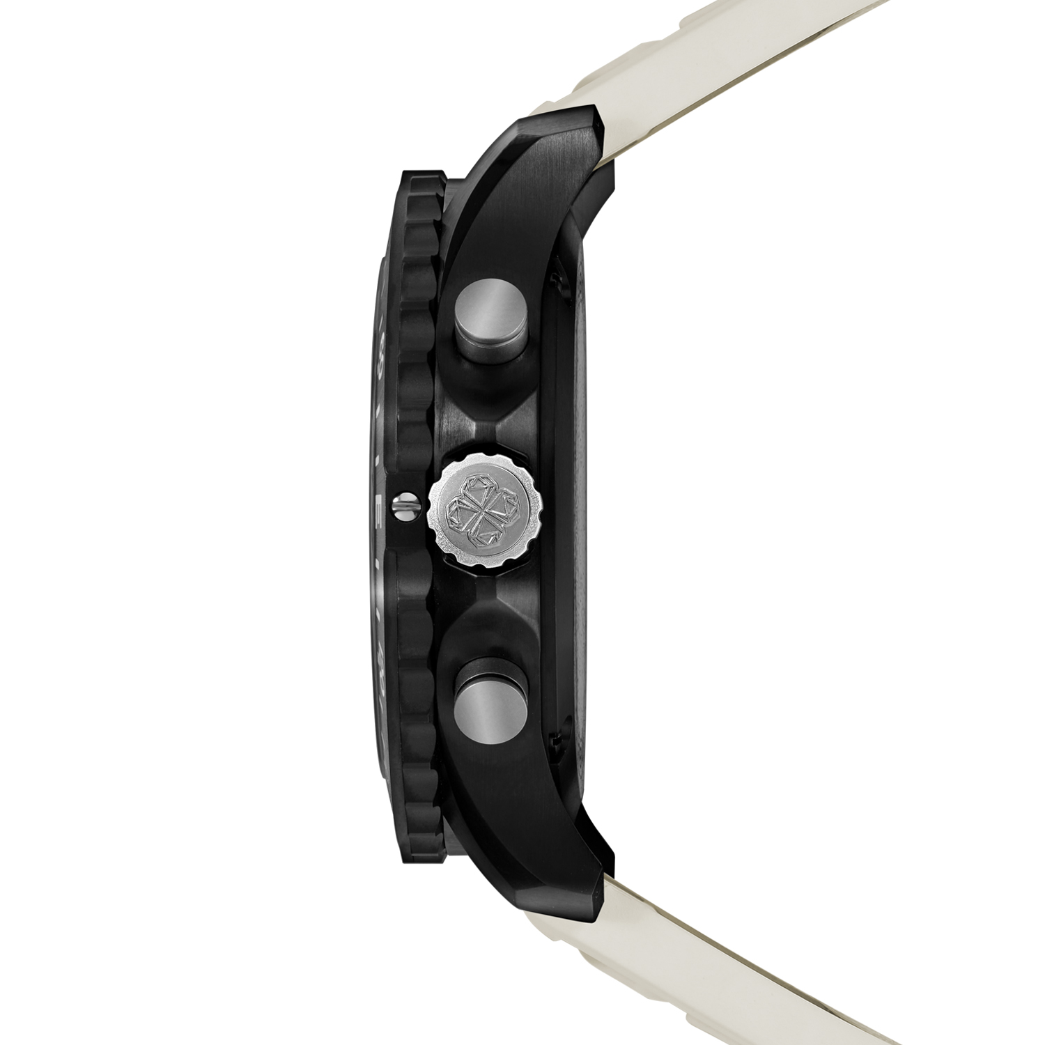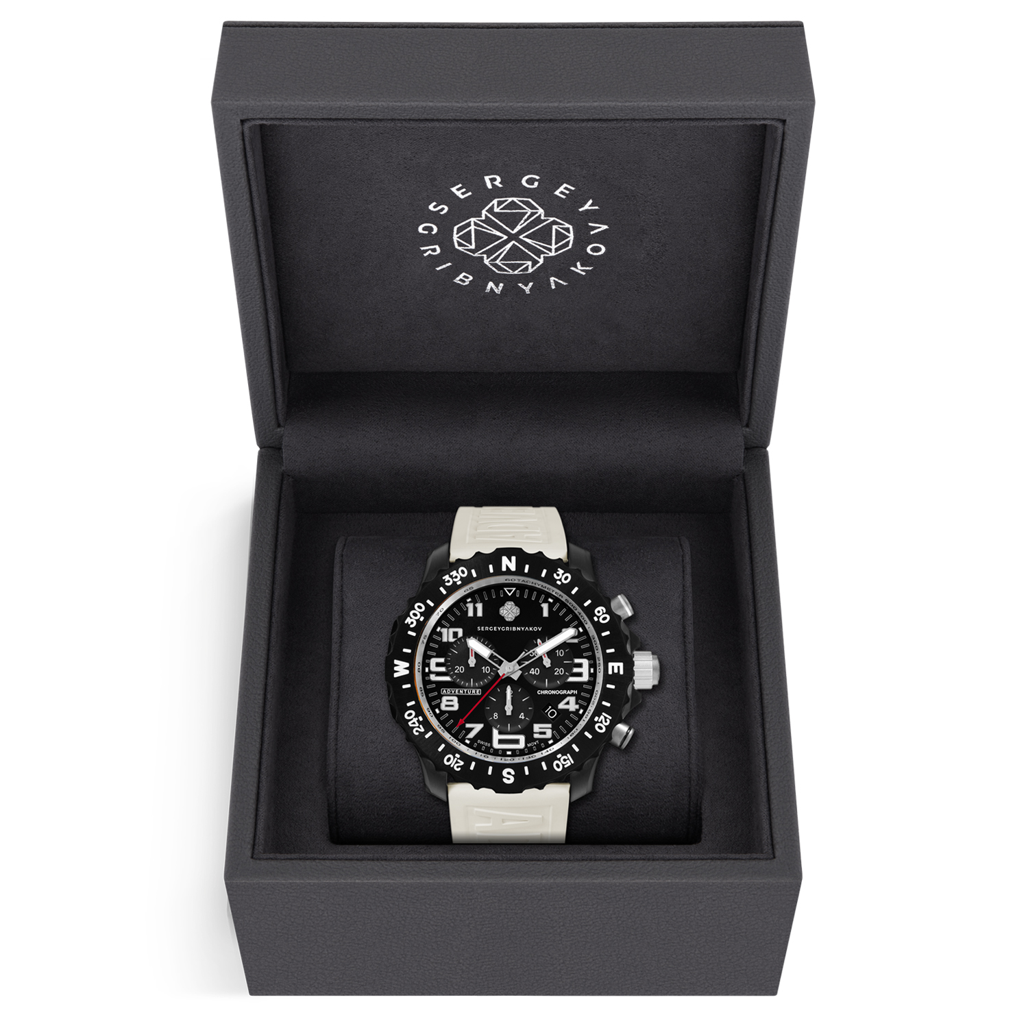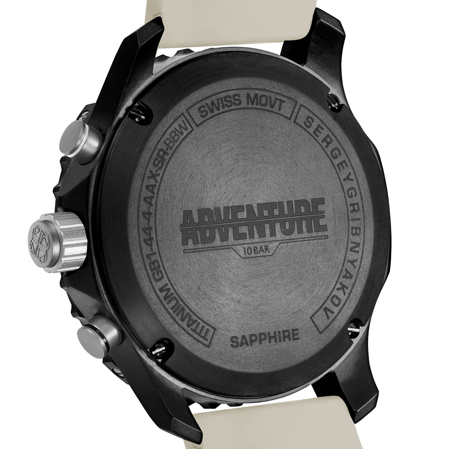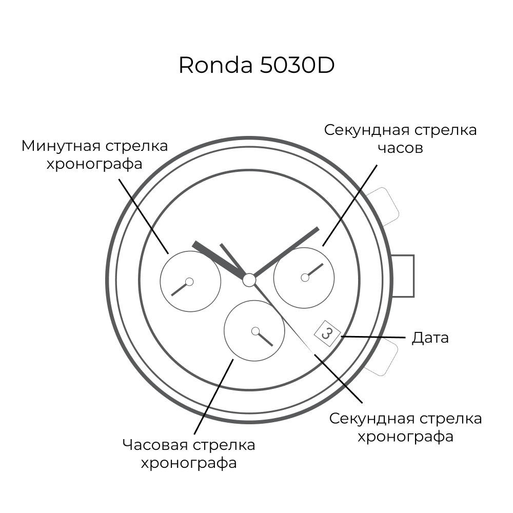 Корпус выполнен из титана. Он легче и прочнее стали. Сапфировое стекло с антибликом защищает циферблат от внешнего воздействия. Надежный швейцарский кварцевый механизм Ronda 5030D оснащен функциями времени в 12 часовом формате, секундной стрелкой, датой и хронографом. Водозащита 10 bar (100 m/330 ft)* позволяет плавать в часах.