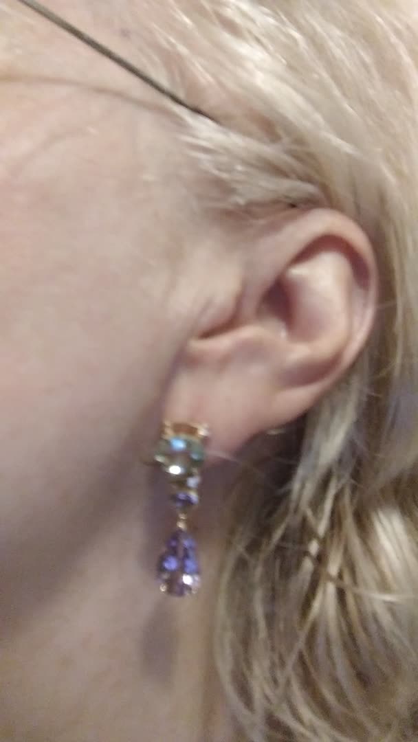 Очень красивые серьги с крупными камнями аметист плюс празиолит.на тонкую мочку.ношу с ними разные кольца с аметистами или празиолитами