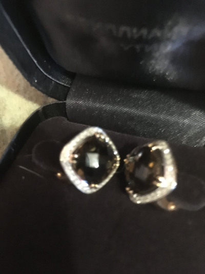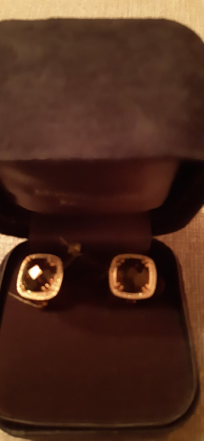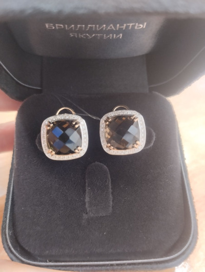 Золотые серьги с бриллиантами природными и кварцами дымчатыми природными