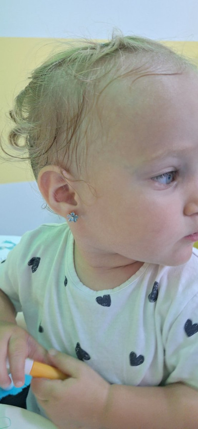 Очень красивые серьги,переливаются, покупали дочери на полтора годика,сейчас смотрятся чуть большевато на мочке(но все равно красиво,все обращают внимание),чуть постарше будут поменьше казаться