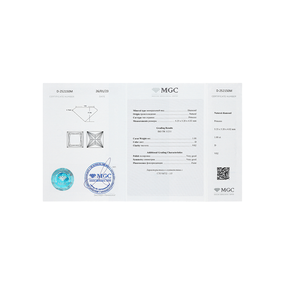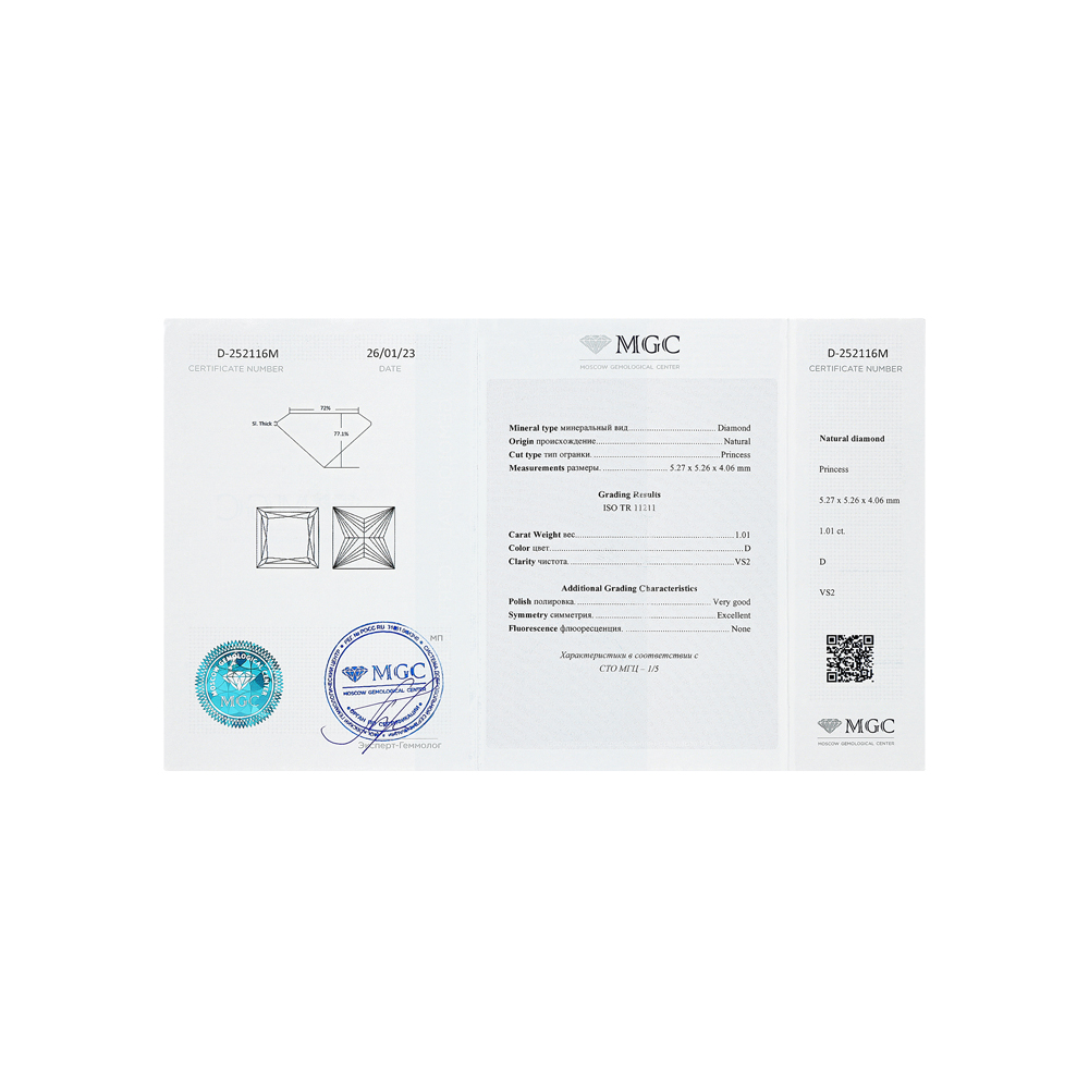 Серьги с 2 бриллиантами природными, 2.01 карат, огранка принцесса 65 граней, цвет 1, чистота 5, тип огранки А;