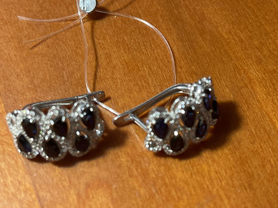 Сережки не маленькие, красивая форма. Сапфиры по цвету и чистоте на всех парах разные, смотрела несколько изделий. Сапфиры облагороженные, половина камня это нат. сапфир, а половина ювелирное стекло т.е. камень клеенный. В целом изделие смотрится хорошо.
