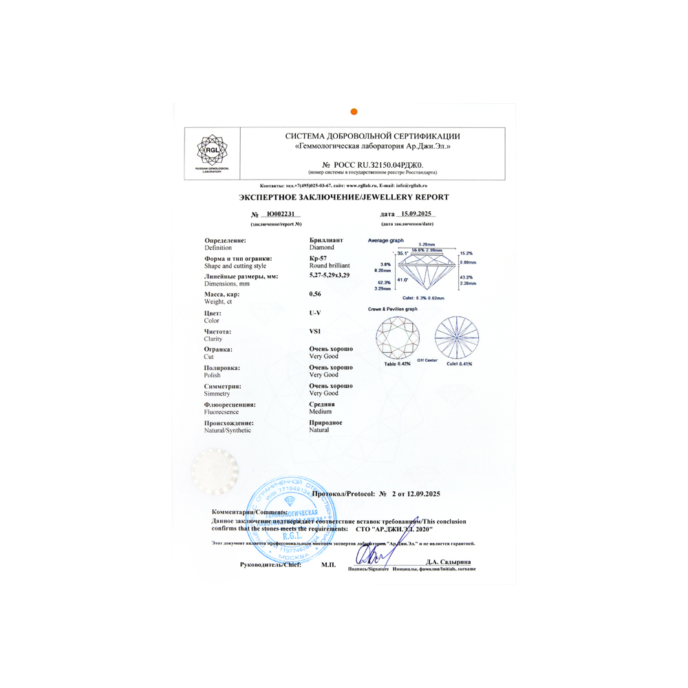 1 бриллиантом желтым природным, 0.5 карат, огранка круг 57 граней, цвет 8-5, чистота 6, тип огранки А;
