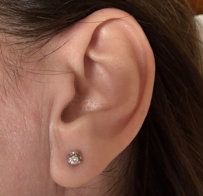 Давно запланировала эту покупку для второго и третьего прокола. Очень красивые пуссеты с винтовым замком. Смотрятся солидно. Хорошо сочетаются с серьгами из белого золота.