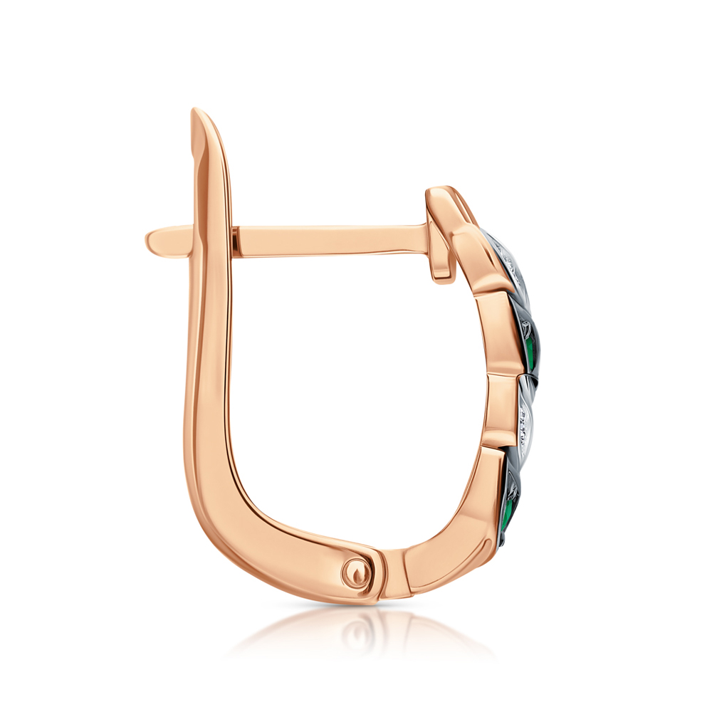Универсальная классика. Серьги выполнены из розового золота с дорожкой из бриллиантов и изумрудов. Нежные, утонченные, подойдут не только к деловому костюму, но и дополнят образ любой модницы.