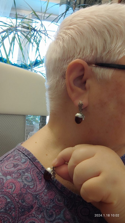 Серьги на ушке смотрятся красиво. Янтарь темно - коричневого цвета. Необычный цвет для янтаря. А в комплекте с кулоном, надетым на толстую жесткую цепочку из серебра, хорошо сочетается с сережками.