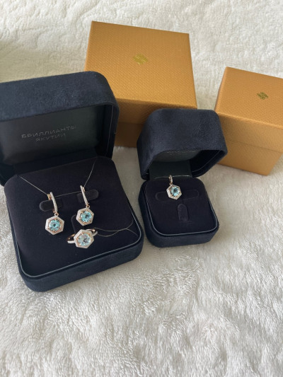 Очень красивый комплект , камни сверкают , бриллианты само собой сверкают но и топаз очень очень красиво блестит