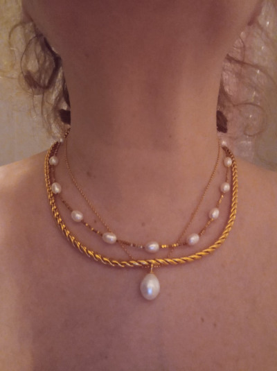 Красивое колье, жёлтое, теплое. Купила вместе с браслетом комплект. Носить думаю его с жемчугом, мне так нравится.