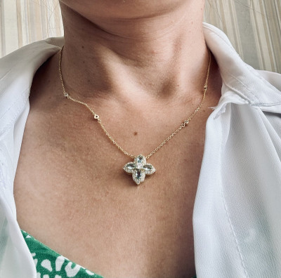 Очень шикарное шейное украшение. Сверкает как бриллиант. Я очень довольна покупкой. Собираю комплименты каждый день. Ношу не снимая, цвет не сошел еще