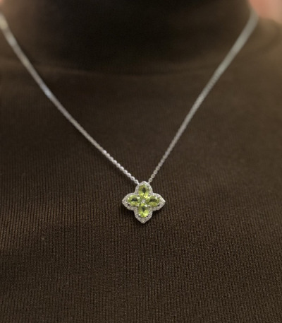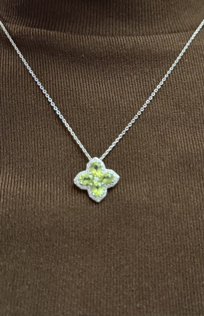 Серебряное шейное украшение с фианитами и хризолитами природными