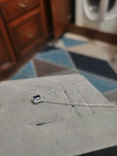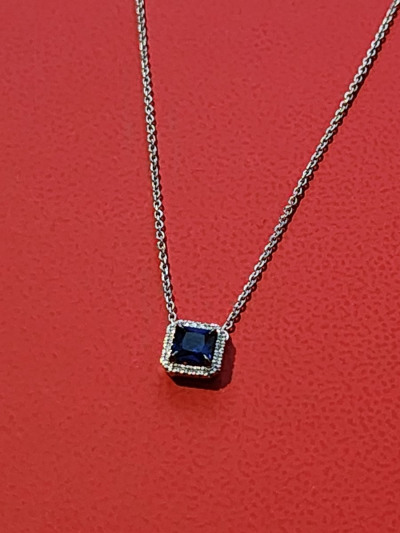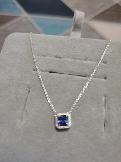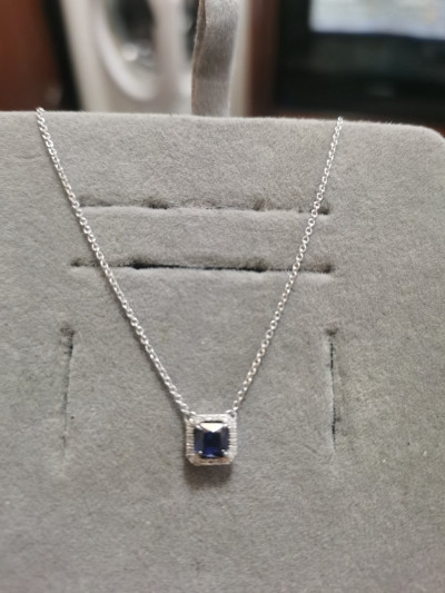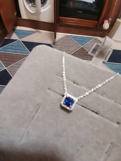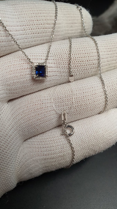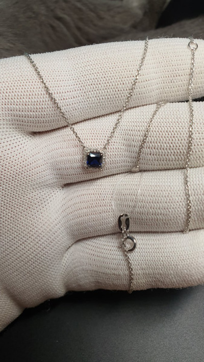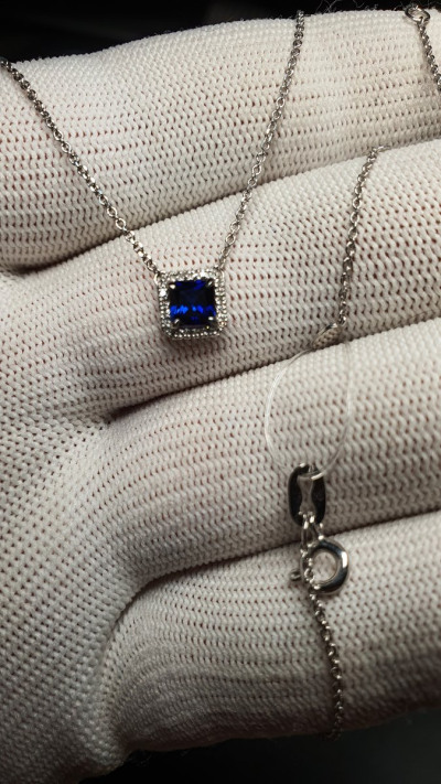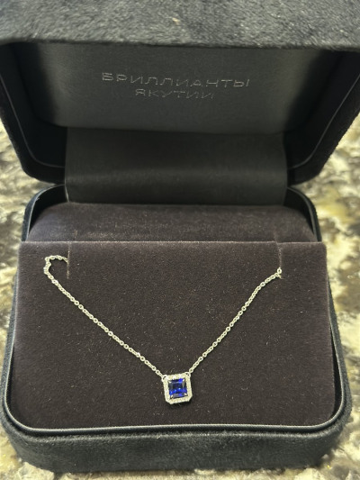 Очень аккуратная, оптимального размера подвеска с цепочкой из белого золота с сапфиром и россыпью бриллиантов. Камень достаточно светлый. Подвеска с очень короткой цепочкой под высокое ношегие. Рекомендую.