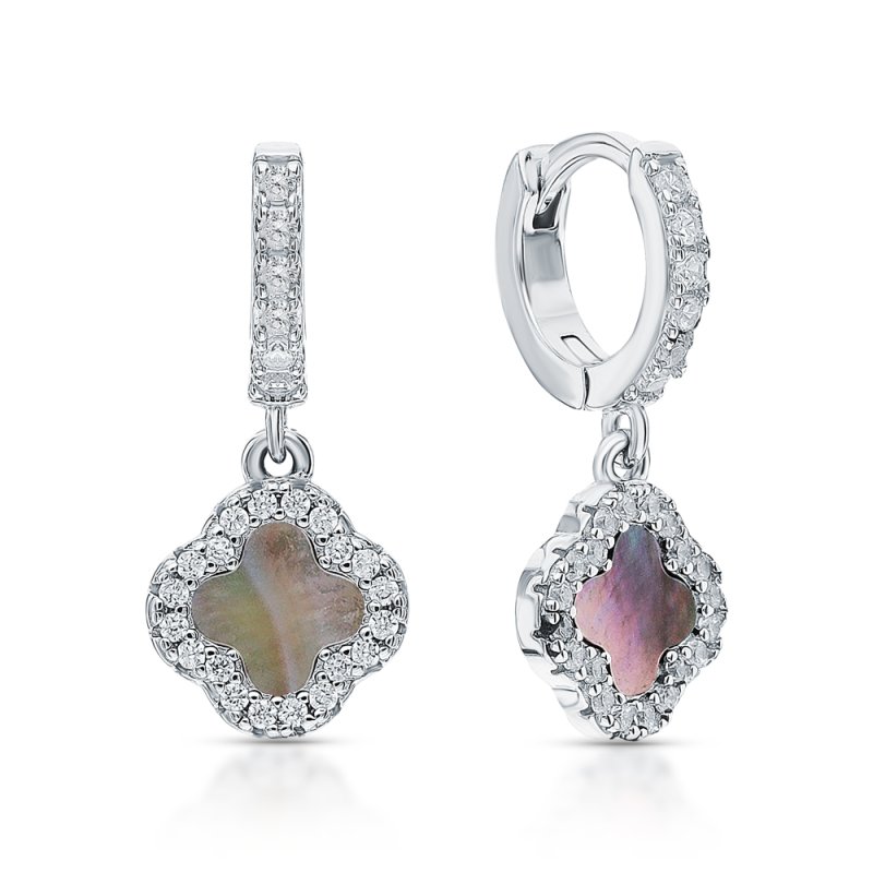 Серьги с 38 бриллиантами природными, 0.15 карат, огранка круг 17 граней, цвет 2, чистота 2, тип огранки А; 80 бриллиантами природными, 0.17 карат, огранка круг 17 граней, цвет 2, чистота 2, тип огранки А; 4 бриллиантами черными природными облагороженными, 0.01 карат, огранка круг 57 граней, цвет 7, чистота 6, тип огранки А; Белое золото 585 пробы.