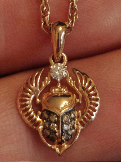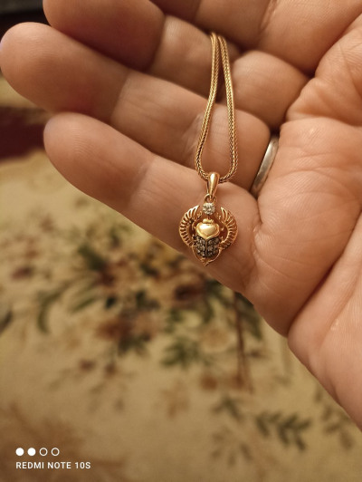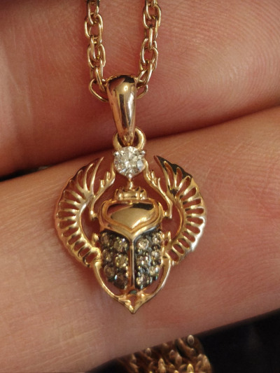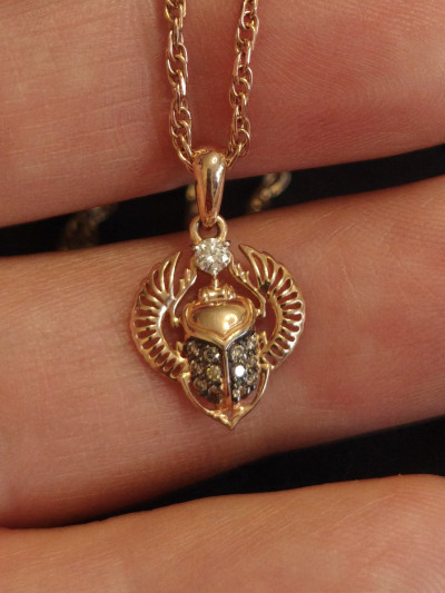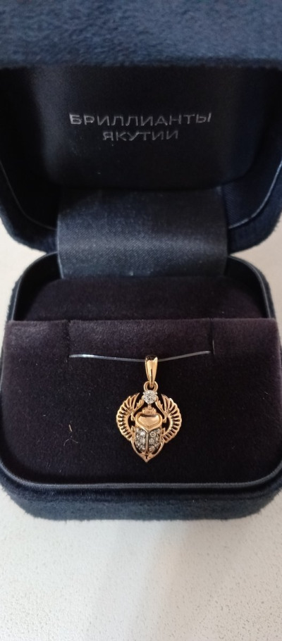 Очень красиво сделан жучок скарабей, бриллианты в двух цветах оттеняют и дополняют друг друга 😍, подвеска средний размер, вес почти грамм, что больше заявленного, ушко подойдёт для цепочки любой ширины 🤗. Очень довольна покупкой такого симпатичного необычного украшения, с учетом скидок и бонусов цена вышла приятная👍