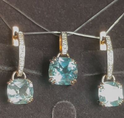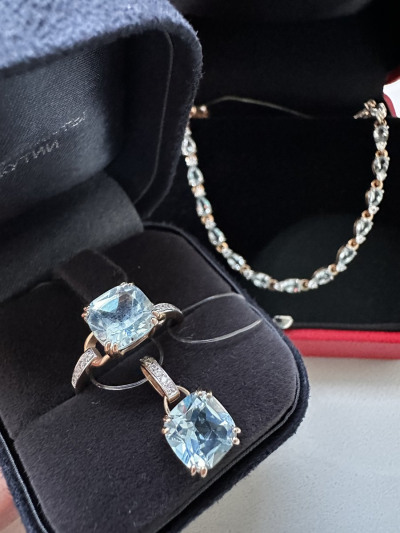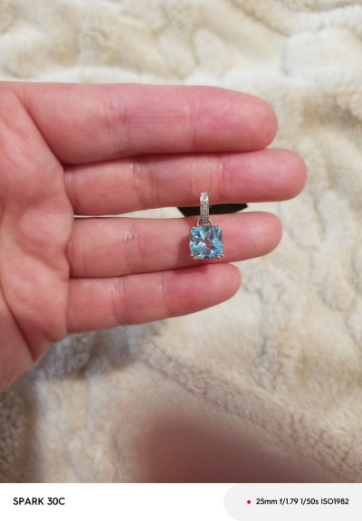 Очень красивая и нежная подвеска. Топаз яркий, насыщенный. Бриллиантики маленькие, блестят ярко. Куплена в комплект к серьгам для подарка.