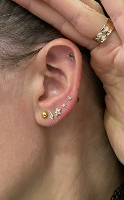 Хороший пирсинг ,выбрала для форвард хеликса (сверху раковины) толщина ,длинна и вообще размер серьги идеальная . Ношу 2 года все камушки на месте