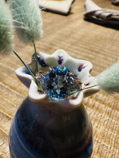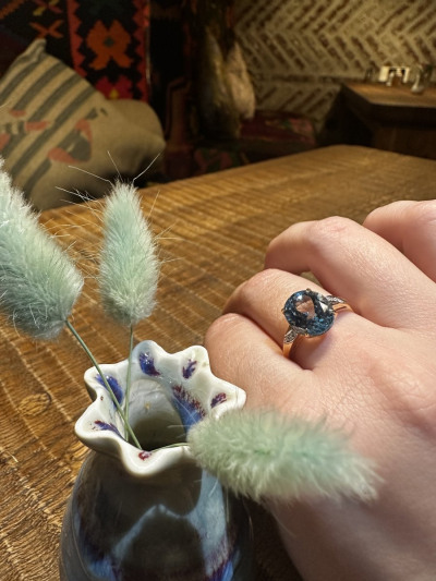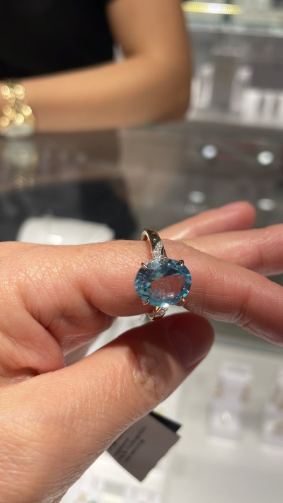 Хотела изначально другое кольцо, но нужного размера в наличии не оказалось . Пошла смотреть что-то из наличия и глаз упал на это кольцо. Большой топаз и мелкая россыпь бриллиантов. Дорого-богато. Как я люблю.