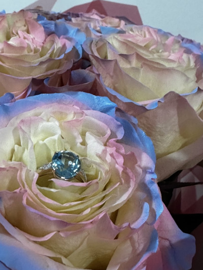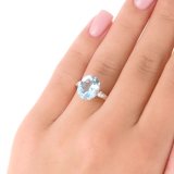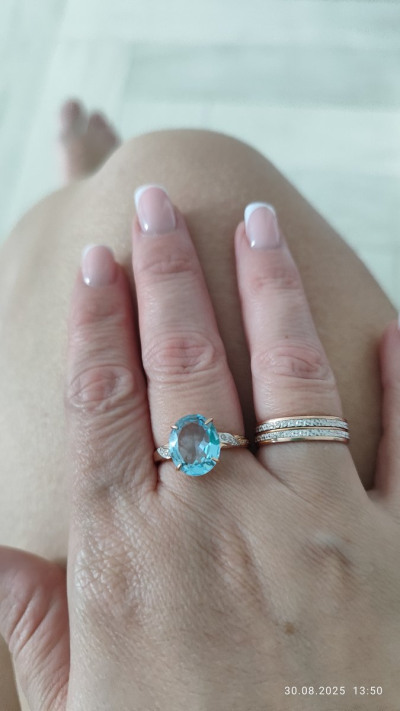 Топаз Скай,крупный,огранки овал,по плечикам кольца установлены бриллианты.