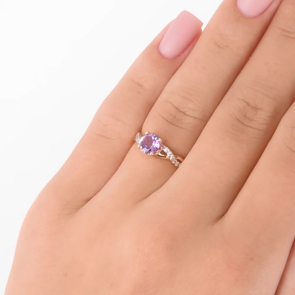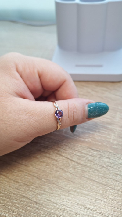 Представляем вам изысканное золотое кольцо с аметистом и бриллиантами от бренда "БРИЛЛИАНТЫ ЯКУТИИ". Это уникальное украшение впечатлит вас своей элегантностью и изысканностью. Кольцо украшено 10 бриллиантами, общим весом 0.03 карата, и одним аметистом весом 0.71 карата. Бриллианты имеют огранку круг с 17 гранями, цвет 2 и чистоту 2. Камень аметист имеет огранку типа В. Изделие выполнено из розового золота 585 пробы. Это кольцо станет прекрасным дополнением к вашему образу и подчеркнет вашу индивидуальность. Позвольте себе ощутить неповторимое очарование этого украшения.