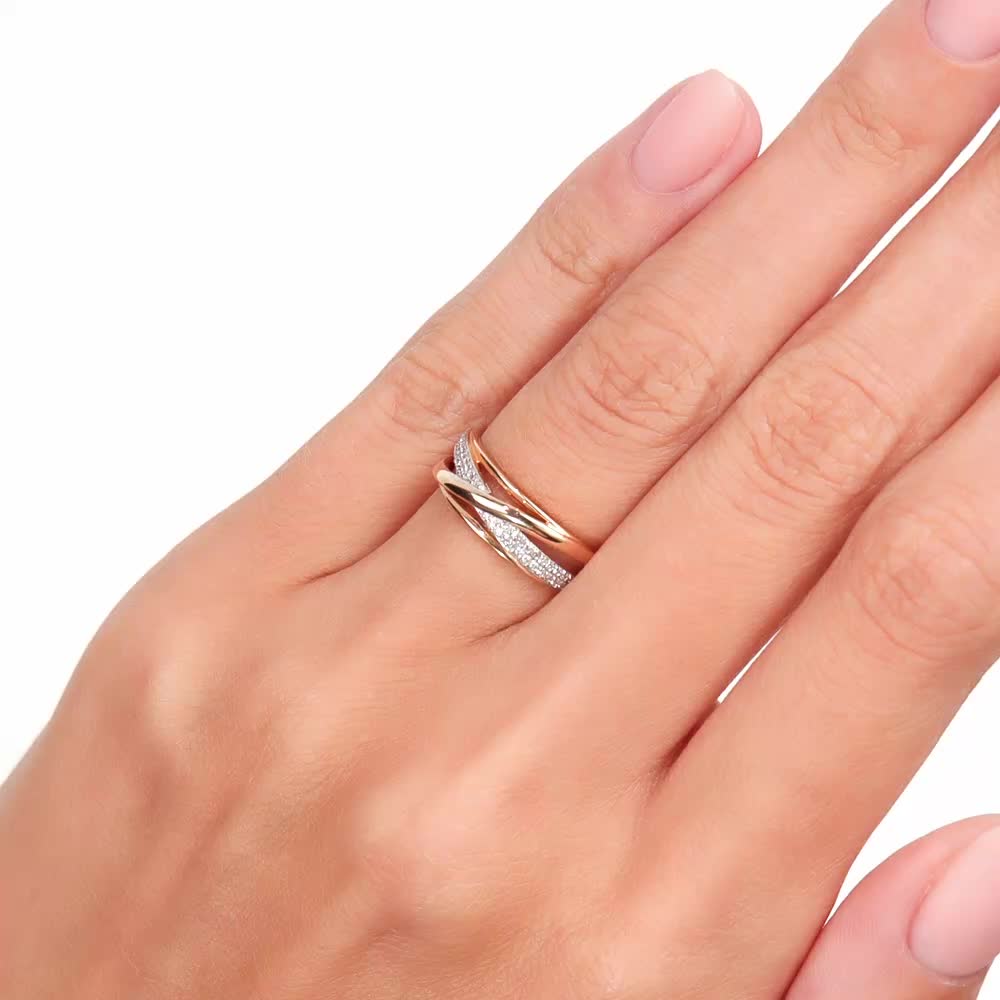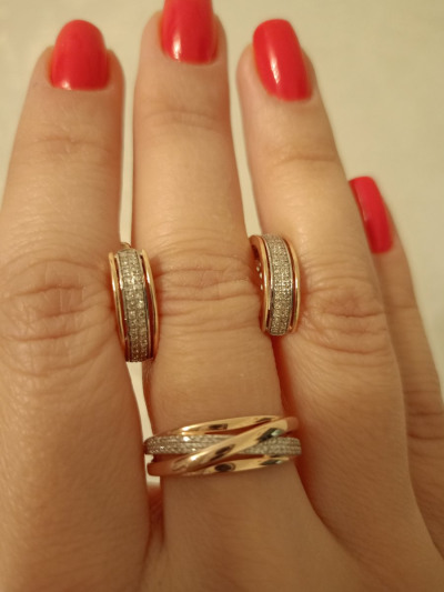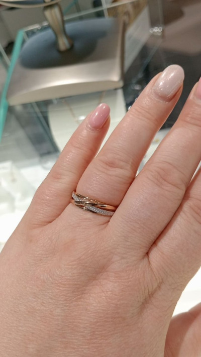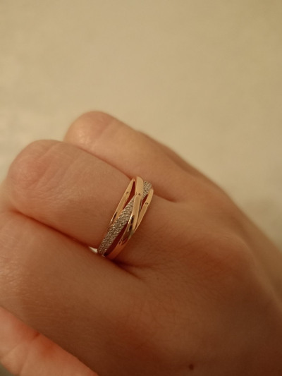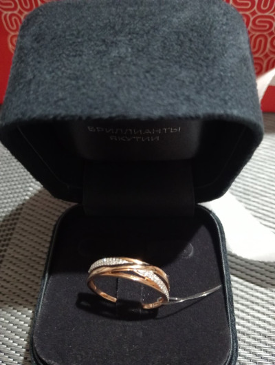 Прекрасное колечко неизбитого дизайна, маленькие бриллиантики, неплохо блестят, хотя и 17 граней. Взяла в комплект к сережкам-дорожке.