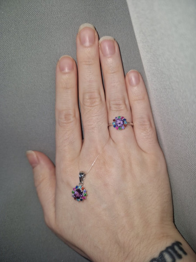 Очень яркое, красивое колечко. Радует своими переливами, разноцветные фианиты и большой натуральный аметист. Серьги тоже очень хорошие, не маленькие, размер как надо. Рекомендую к покупке