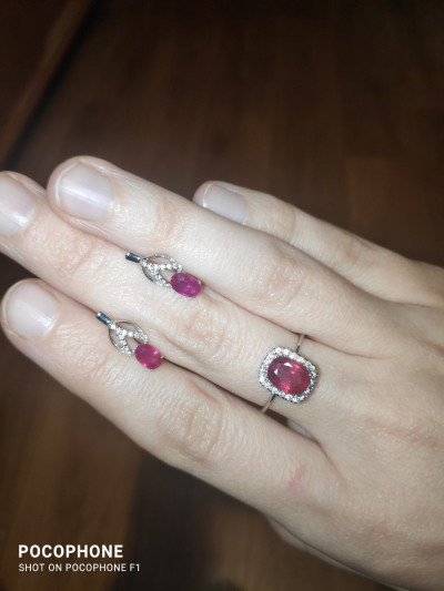 Это кольцо понравилось мне больше всех из вариантов с натуральным рубином. Сережки я подобрала к нему. Хотя у них был вариант колечка в комплекте - я не смогла устоять перед этим красивым камушком, который так сияет в обрамлении фианитов. 🥺