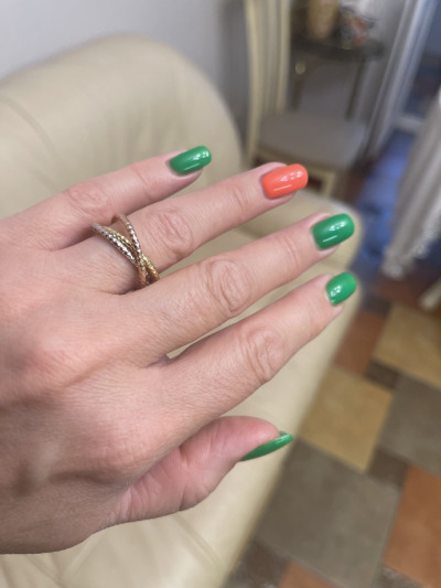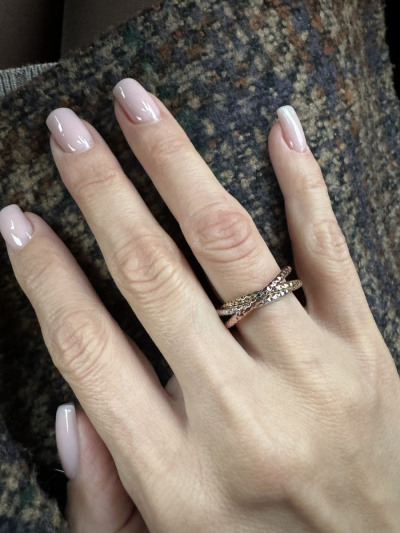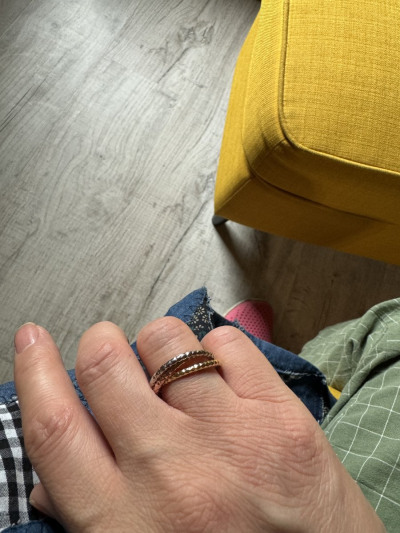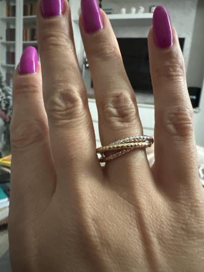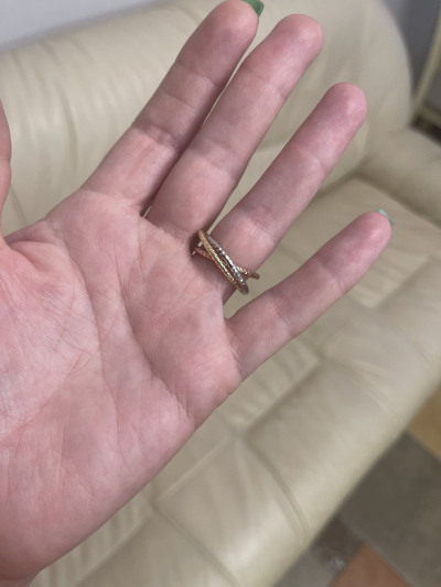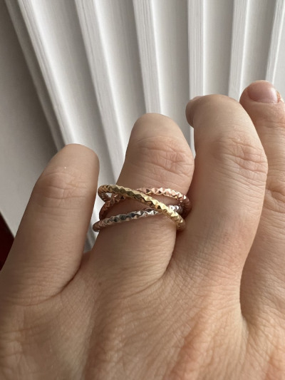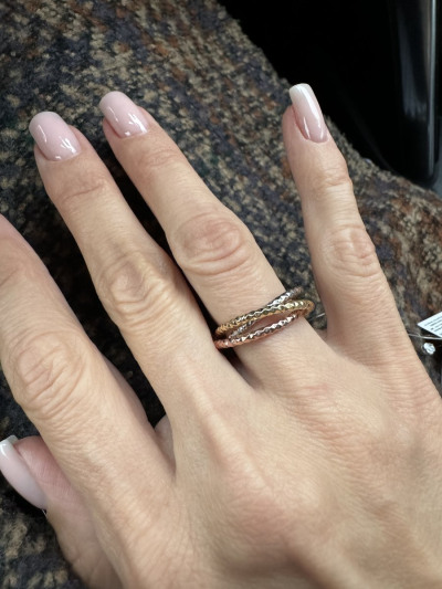 Понравилось колечко трех цветов, можно сочетать с любыми вещами, универсальное, лаконичное, ничего лишнего, интеллигентное.берите на полразмера меньше, больше мерит