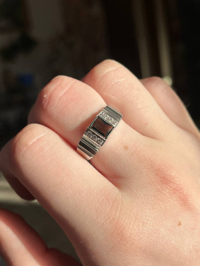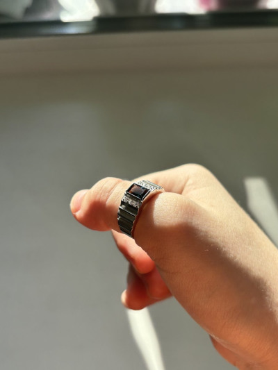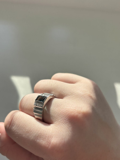 Брутальное украшение мужской руки. В меру блескучий. Хороший дуэт фактур отделки изделия (сатинированный и полированный металл) Фиониты добавляют шарма ювелирному кристаллу на фронтальной части перстня. Огорчает только очень тонкий металл. Перстень (металл) деликатный и потребует очень осторожного обращения. Меньше 3 гр на руке не чувствуется. По мне, это минус. Легко потерять... Но это дело привычки.