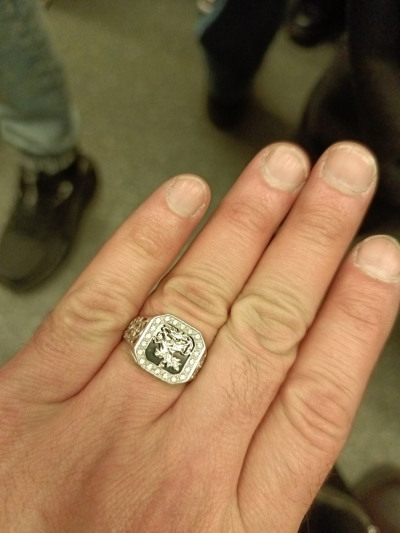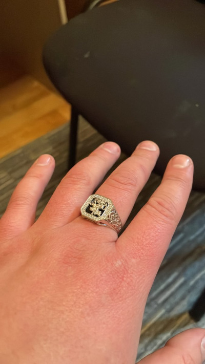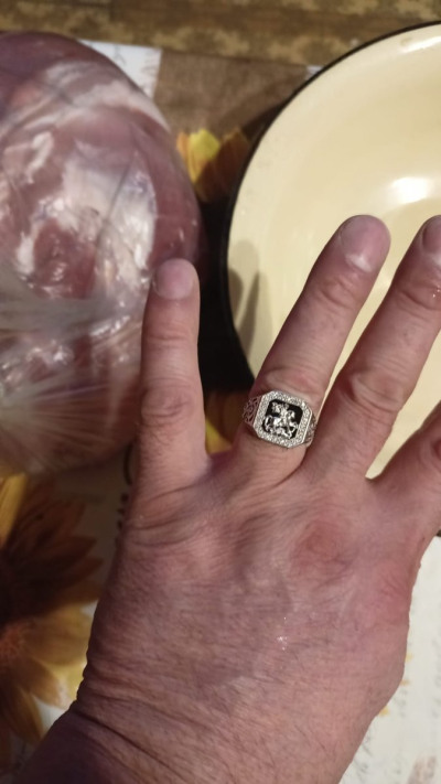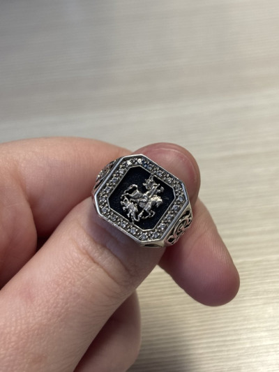 Мужской перстень с печаткой, на которой изображен Георгий Победоносец во время свершения его знаменитого подвига: победа над змеем. Змей - символ дьявола-искусителя. Победа Георгия означает то, что души верующих будут избавлены от злых намерений, искушений и грехов.