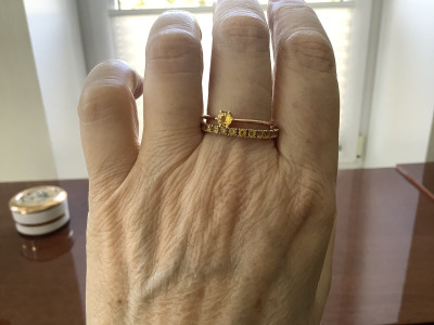 Тоненькое, но симпатичное. Камень прекрасный, сверкает. Камни в моделях разного цвета, выбрала более желтый (хотелось, чтобы уходил в зеленый), есть более оранжевые. Каратность 0.374 (в оранжевом была побольше), вес 1.29, 17 размер, но камешек смотрится не маленьким, играет при разном освещении. Шинка тонкая, но полновесная. Из минусов - форма немного продолговатая и шинка тонкая, поэтому крутится, ну и под перчатки особо не поносишь, каст высокий. За эту цену - отличное приобретение.