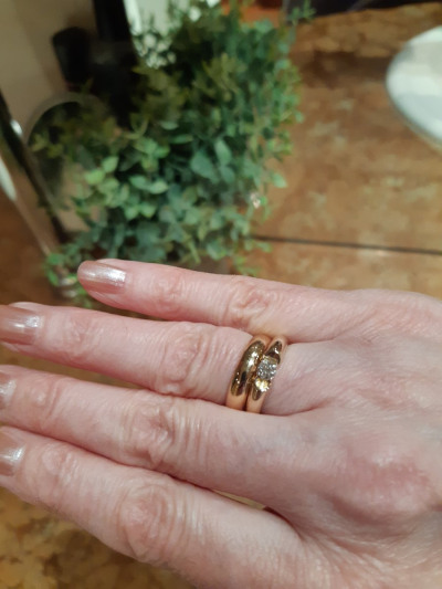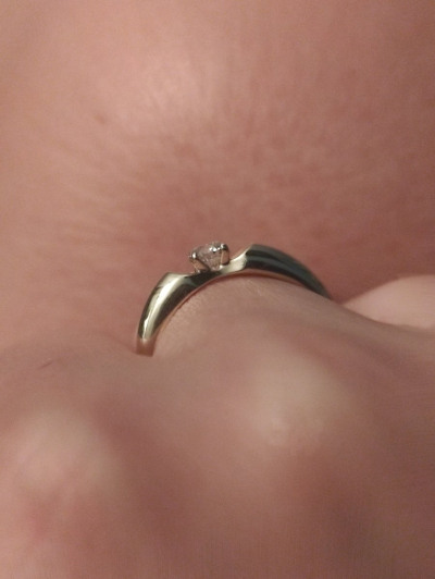 Ничего лишнего, а смотрится прилично и солидно. Камешек вполне себе заметный и красиво сверкает. Мне нравится носить с обручалкой.