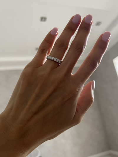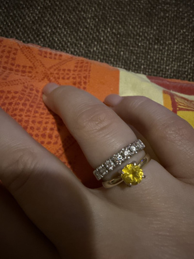 Увидела в отзывах к другому кольцу и захотела так же)) дорожка крупная,у меня камни не желтят, смотрится солидно. Подходит ко многим кольцам.