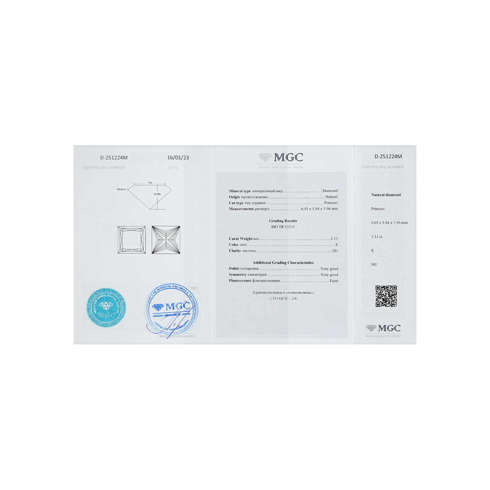 • Кольцо с 1 бриллиантом природным, 1.01 карат, огранка принцесса 65 граней, цвет 2, чистота 6, тип огранки А;