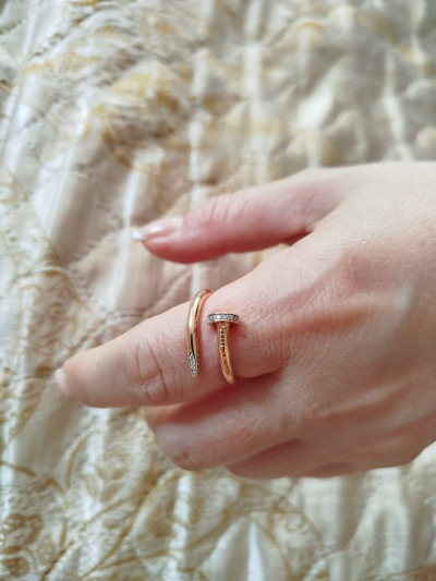 Давно мечтала об этом кольце. И вот эта мечта на моем пальце. Обычно ношу 17,5 размер, но хорошо подошел 18 размер.Кольцо не мелкое, классно смотрится.