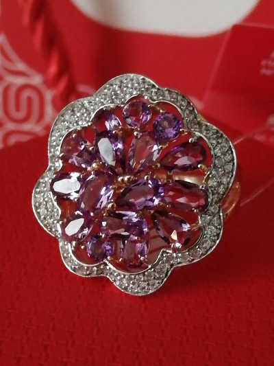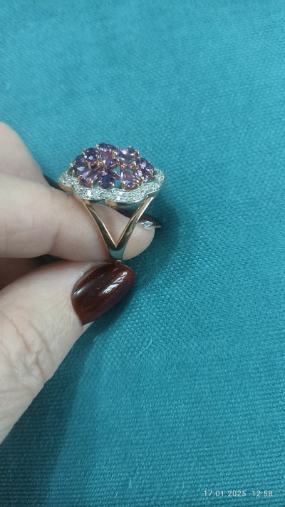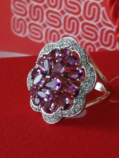 Очень красивое кольцо, крупное, с яркой россыпью природных аметистов и окантовкой из фианитов. Сверкает невероятно, на руке хорошо сидит. Позолота выглядит как настоящее красное золото. Вместе с комплектными серьгами выглядит бомбически достойно.