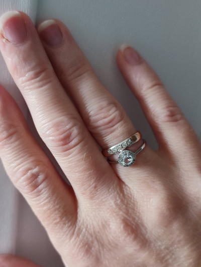 Кольцо смотрится дорого. Можно носить как отдельно, так и в паре с обручальным кольцом. Шинка хоть и тонкая, но полновесная. Сидит плотно на пальце, видимо за счёт широкой части с камнями. Не цепляется за одежду. Мне достался 15 размер с хорошим весом 1.19 г.
