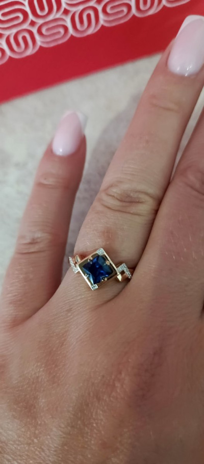Золотое кольцо с бриллиантами природными и сапфиром выращенным
