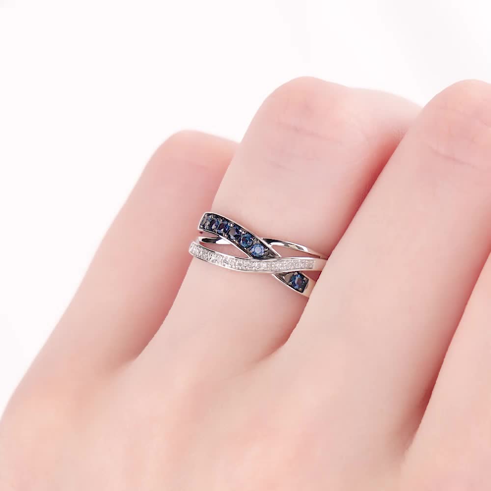 Элегантная классика в новом прочтении. Кольцо выполнено из белого золота с бриллиантами и сапфирами. Визуальный объем кольцу придают легкие, воздушные пересекающиеся линии.