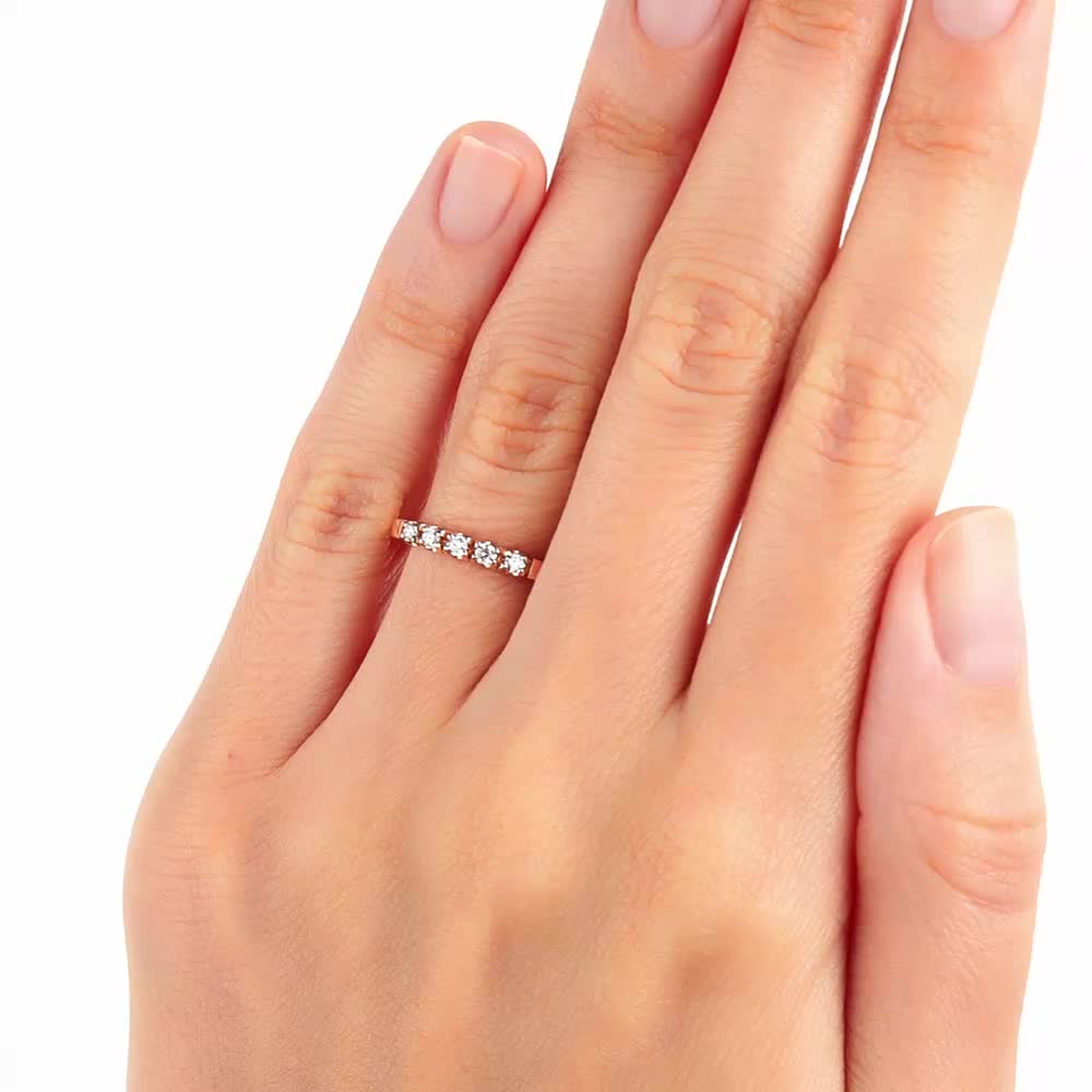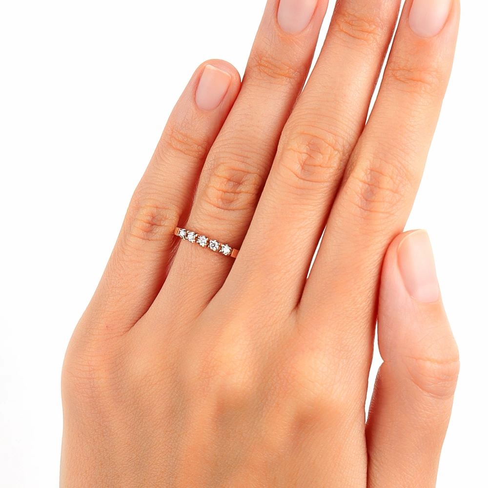 Это изысканное золотое кольцо, украшенное пятью бриллиантами, выполнено в России. Бриллианты имеют круглую огранку с 57 гранями, общий вес составляет 0,14 карата. Цвет камней - 4, чистота - 6, тип огранки - А. Кольцо выполнено из розового золота 585 пробы, вес изделия - 1,15 г. При покупке вы получаете пожизненную гарантию.