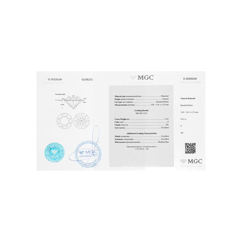 Кольцо «Бриллианты Якутии» с 1 бриллиантом, 0.6 карат, огранка круг 57 граней, цвет 3, чистота 6, тип огранки А;