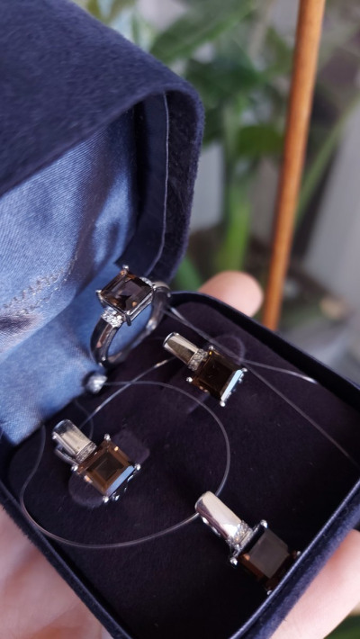 Серебряное кольцо с фианитами и кварцами дымчатыми природными